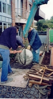wurde ohne Stufe realisiert und mit rund gelegtem schwarzem Granitkleinpflaster hervorgehoben.